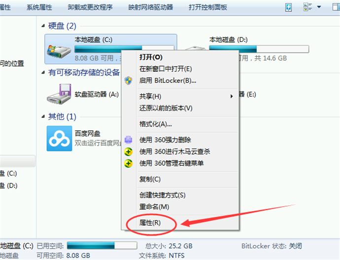 1、鼠標(biāo)右鍵點擊C盤,在彈出的菜單中選擇“屬性”按鈕;