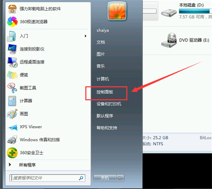 1、打開開始菜單,選中“控制面板”;