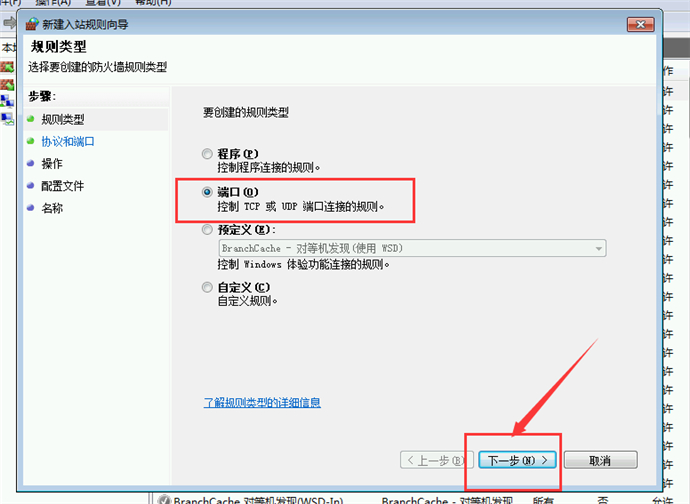 7、在彈出的窗口中,選擇“端口”,并單擊“下一步”;